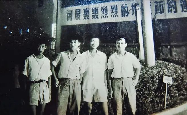 1957年,姜民强、娄旭东、孙光铸、陶甄(自左至右)在中央门外小市江光厂大门前合影