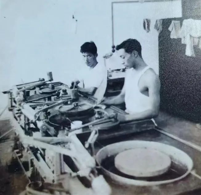 1952年,陶石年(右)与虞景兆(左)在简陋厂房内的两轴机前磨玻璃,地点是中央门外小市厂部老车间