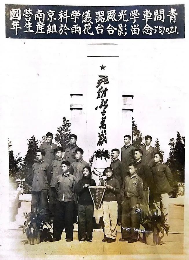 1955年,光学车间青年生产组14名成员,到雨花台开展活动时的留影。当年江光厂凡遇重大节日,总会以各种形式组织赴雨花台开展悼念革命烈士的活动